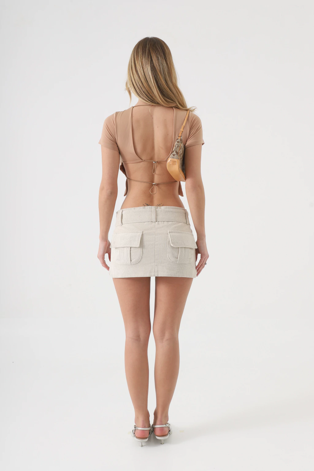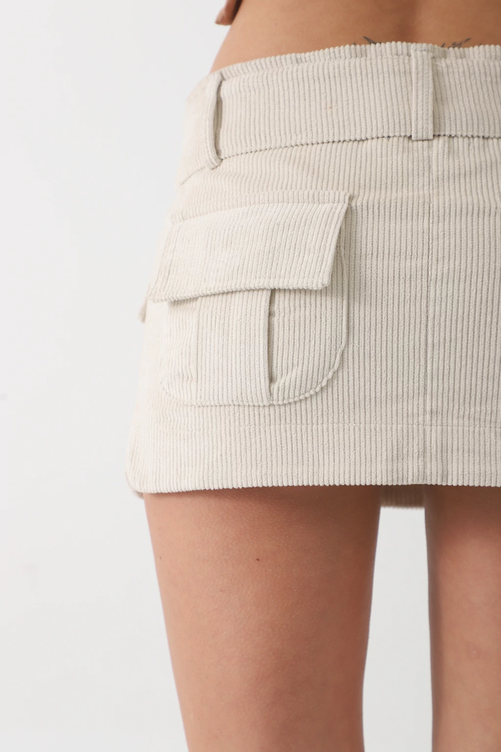 Mini cargo de corderoy 100% de algodón, con cierre delantero y bolsillos en delantero y espalda. Incluye el cinto con hebilla forrada.