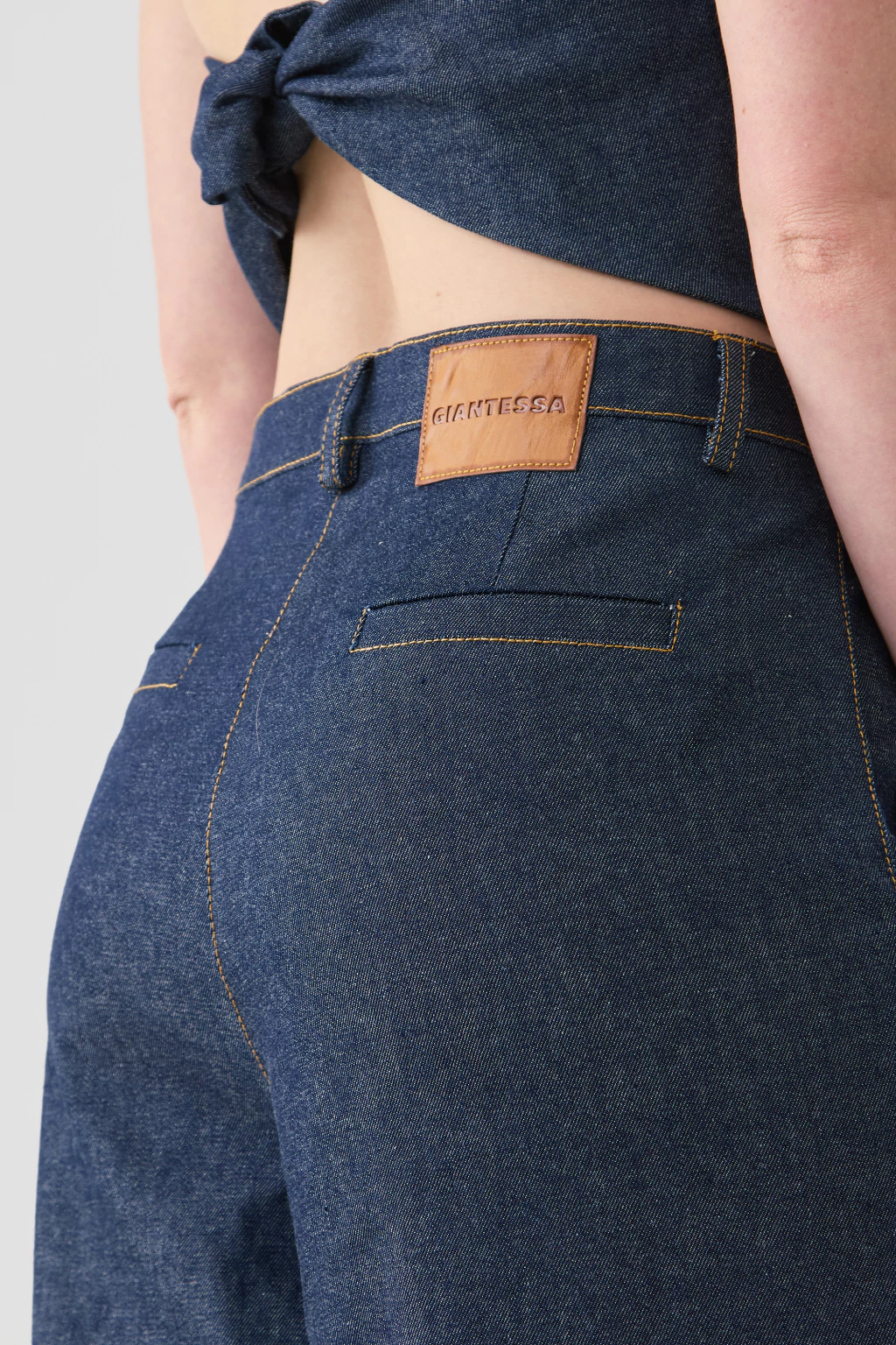 Pantalón ancho en denim azúl indigo, confeccionado en 98% algodón y 2% spandex. Con nuestra iconica badana Giantessa, con hilo pespunte jeanero.