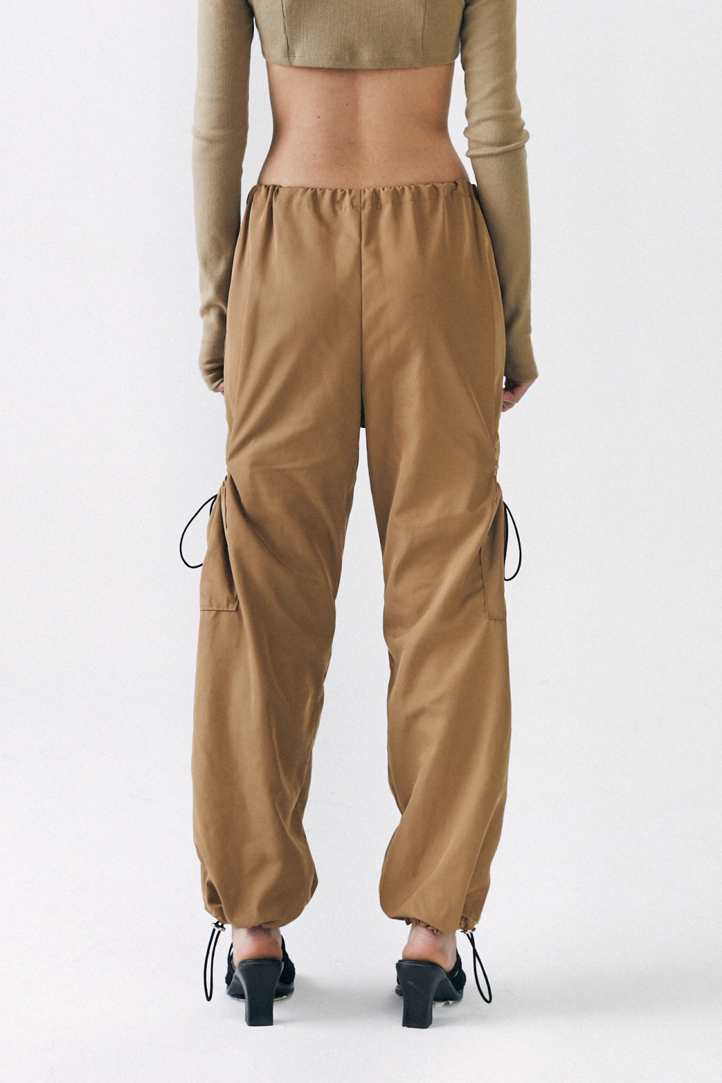Pantalón estilo parachute cargo confeccionado en tela memory 100% poliéster. Cuenta con bolsillos laterales y tiene cordón elástico y tancas metálicas en botamanga, cintura y bolsillos
