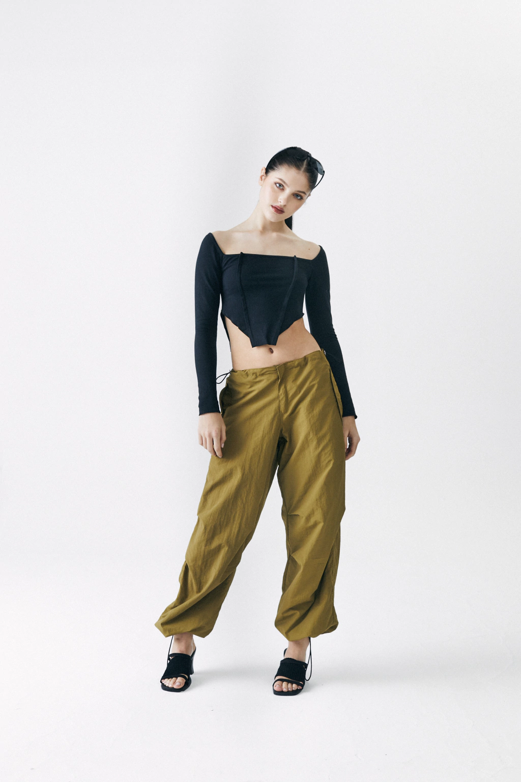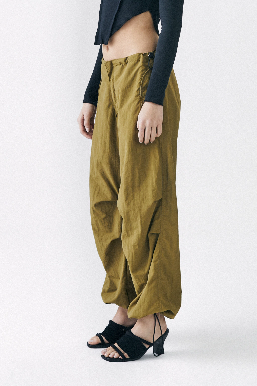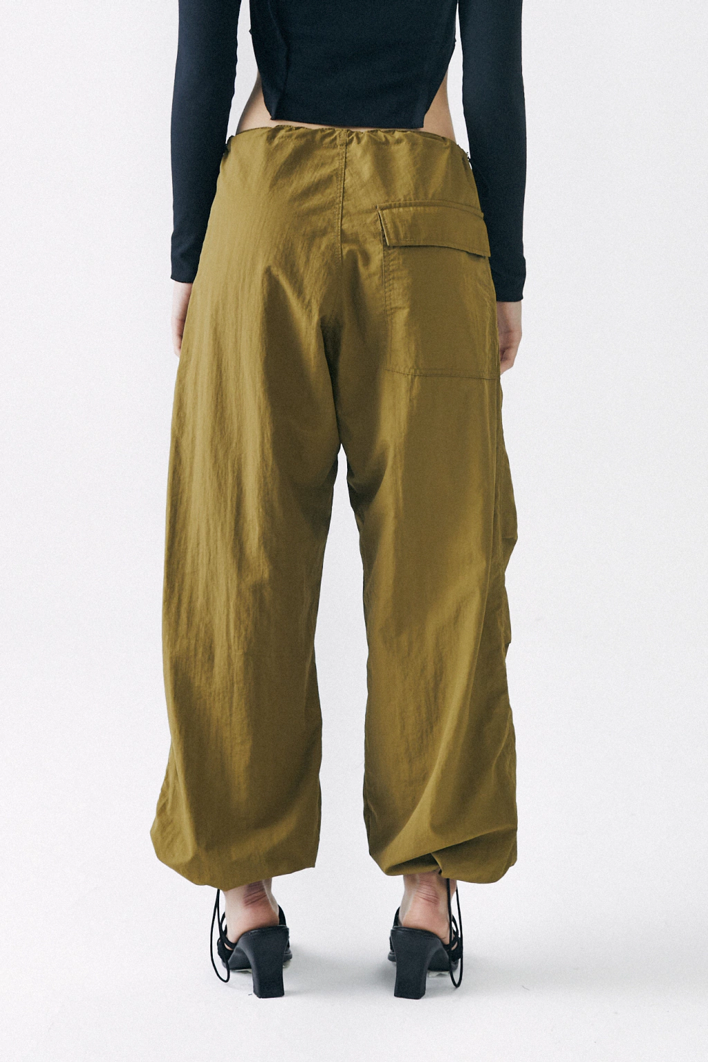 Pantalón tipo paracaidista con calce oversize. Confeccionado en tela memory, tipo pilotera color verde caqui. Se puede usar tiro bajo o tiro alto. Lleva cierre con boton en la parte delantera y además cuenta con elásticos regulables en cintura y botamanga que permiten regular el calce. Tiene bolsillos en los laterales y uno con tapa en la parte de atrás. El pantalón mas trendy y versátil está en Giantessa, úsalo de día o de noche y sentite la it girl del momento.