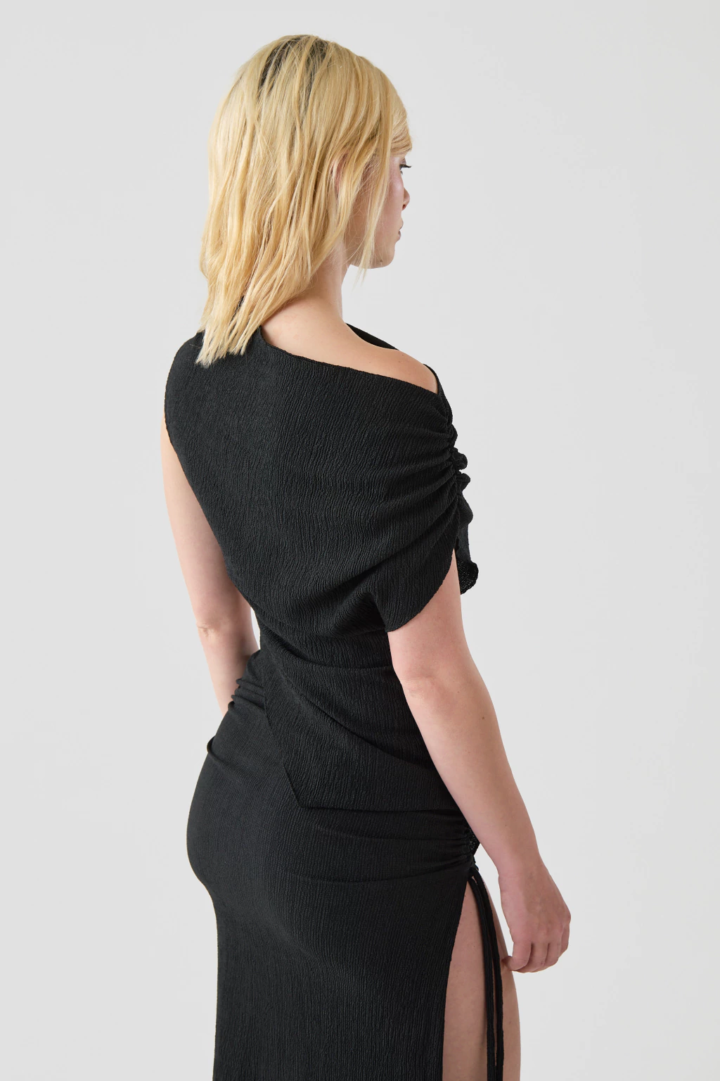 Top largo irregular, confeccionado en jersey texturado con spandex. Con frunces en hombro y lateral.