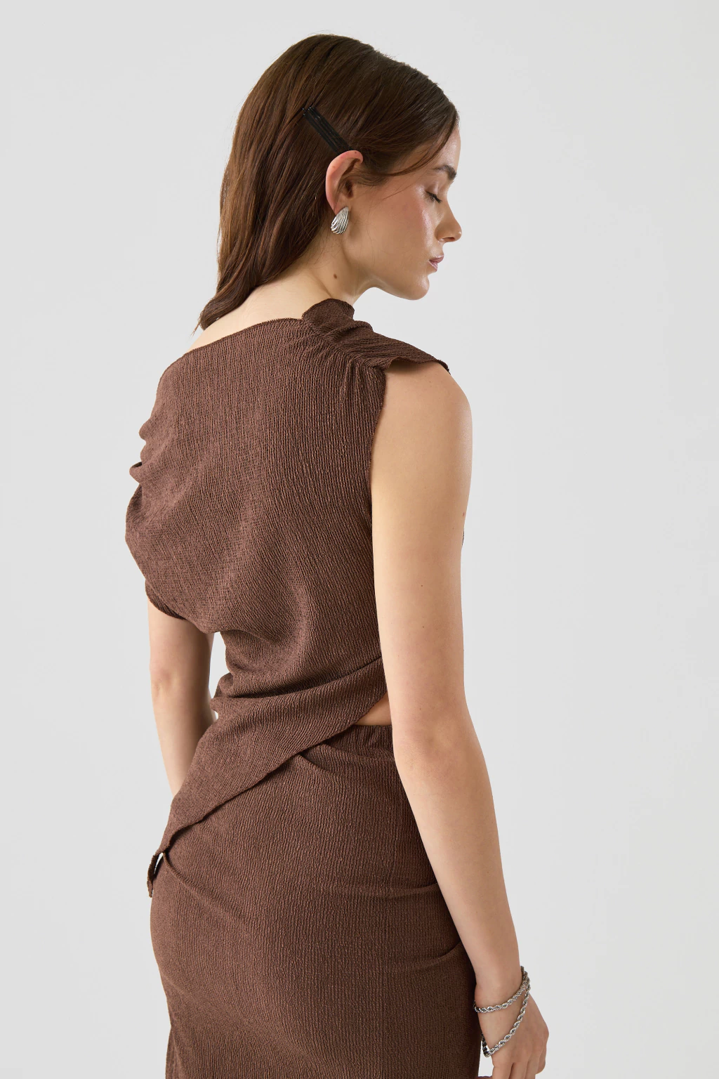 Top largo irregular, confeccionado en jersey texturado con spandex. Con frunces en hombro y lateral.